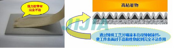 本公司的超级不粘膜是在基材表面上进行凹凸处理,在凹部处用本公司开发的非粘合成涂料填埋并形成复合构造膜,该膜将其他方法都没法解决的防粘问题加以解决了。